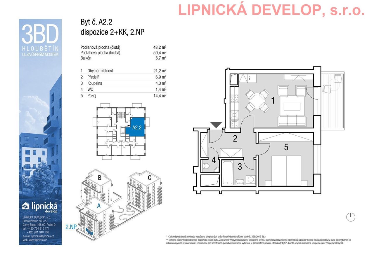 Prodej nového bytu s označením A2.2 o dispozici 2+kk v developerském projektu "NOVOSTAVBA 3 BYTOVÝCH DOMŮ", Hloubětín. Podlahová plocha bytu je 50,4 m2 (užitná plocha bytu je 48,2 m2) + sklepní kóje o výměře 2,1 m2 + balkon o výměře 5,7 m2. Byt se nachází ve 2. nadzemním podlaží bytové domu A. Byt se skládá z obývacího pokoje s kuchyňským koutem, ložnice, koupelny, WC a předsíně. Z obývacího pokoje je vstup na balkon. K bytu je třeba dokoupit parkovací stání, které není v ceně bytu. Parkovací stání je umístěné v 1. podzemním podlaží domu.