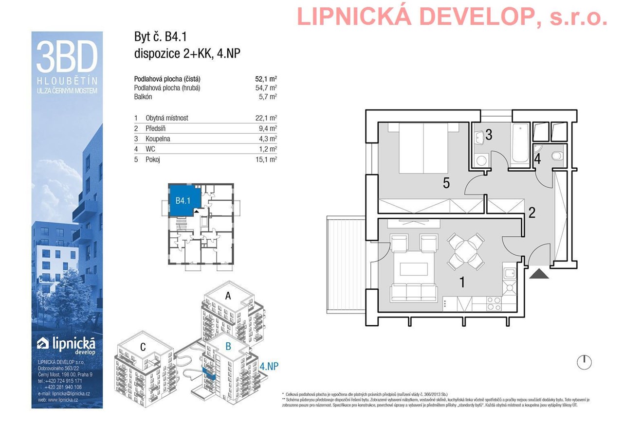 Prodej nového bytu s označením B4.1 o dispozici 2+kk v developerském projektu "NOVOSTAVBA 3 BYTOVÝCH DOMŮ", Hloubětín. Podlahová plocha bytu je 54,7 m2 (užitná plocha bytu je 52,1 m2) + sklepní kóje o výměře 2,1 m2 + balkón o výměře 5,7 m2. Byt se nachází ve 4. nadzemním podlaží domu. Byt se skládá z obývacího pokoje s kuchyňským koutem, ložnice, koupelny, WC a předsíně. Z obývacího pokoje je vstup na balkón. K bytu je třeba dokoupit parkovací stání, které není v ceně bytu. Parkovací stání je umístěné v 1. podzemním podlaží domu.