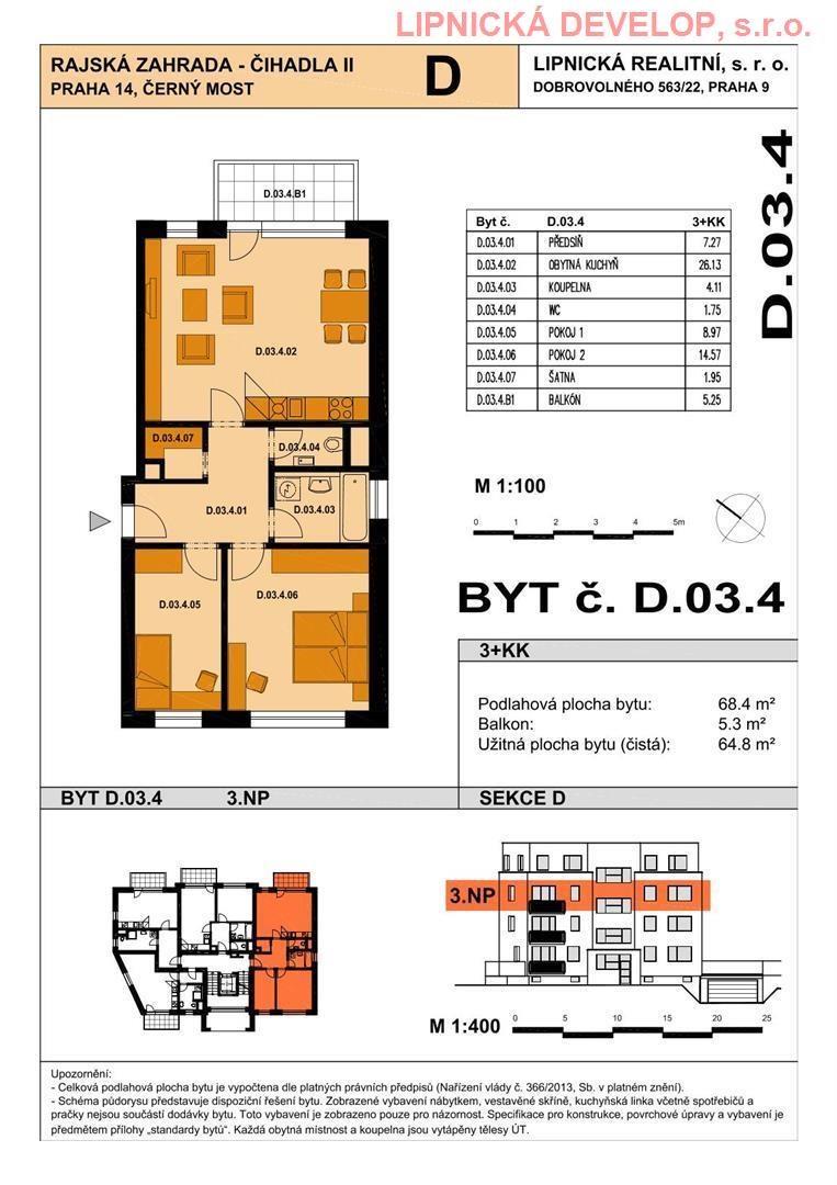 Prodej nového bytu s označení D.03.4 o dispozici 3+kk v developerském projektu AREÁL RAJSKÁ ZAHRADA - ČIHADLA II, BYTOVÉ DOMY "B", "D", PRAHA 9. Byt se nachází v bytovém domě D. Podlahová plocha bytu je 68,4 m2 (užitná plocha bytu je 64,8 m2) + sklepní kóje o výměře 1,9 m2 + balkón o výměře 5,3 m2. Byt se nachází ve 4. nadzemním podlaží domu. Byt se skládá z obývacího pokoje, ložnice 1, ložnice 2, chodby, koupelny a WC.