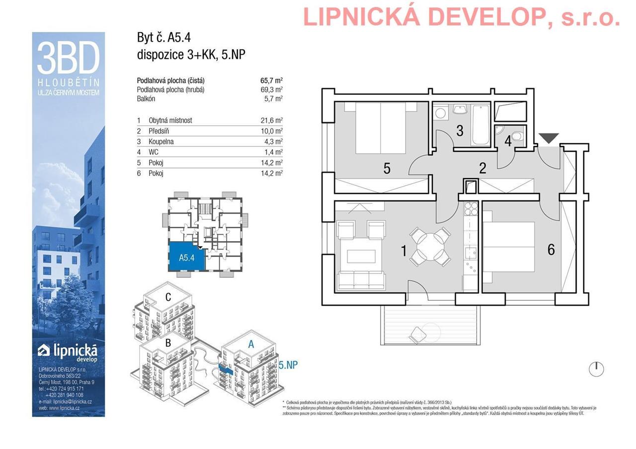 Prodej nového bytu s označením A5.4 o dispozici 3+kk v developerském projektu "NOVOSTAVBA 3 BYTOVÝCH DOMŮ", Hloubětín. Podlahová plocha bytu je 69,3 m2 (užitná plocha bytu je 65,7 m2) + sklepní kóje o výměře 2,1 m2 + balkón o výměře 5,7 m2. Byt se nachází v 5. nadzemním podlaží domu. Byt se skládá z obývacího pokoje s kuchyňským koutem, ložnice 1, ložnice 2, koupelny, WC a předsíně. Z obývacího pokoje je vstup na balkón. K bytu je třeba dokoupit parkovací stání, které není v ceně bytu. Parkovací stání je umístěné v 1. podzemním podlaží domu.